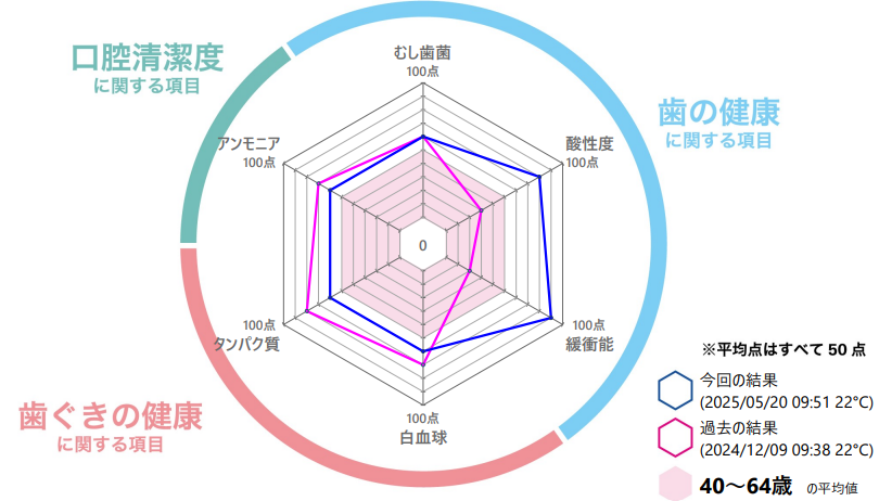 ①歯の健康(むし歯菌、酸性度、緩衝能) ②歯ぐきの健康(白血球、タンパク質) ③口腔清潔度(アンモニア) |