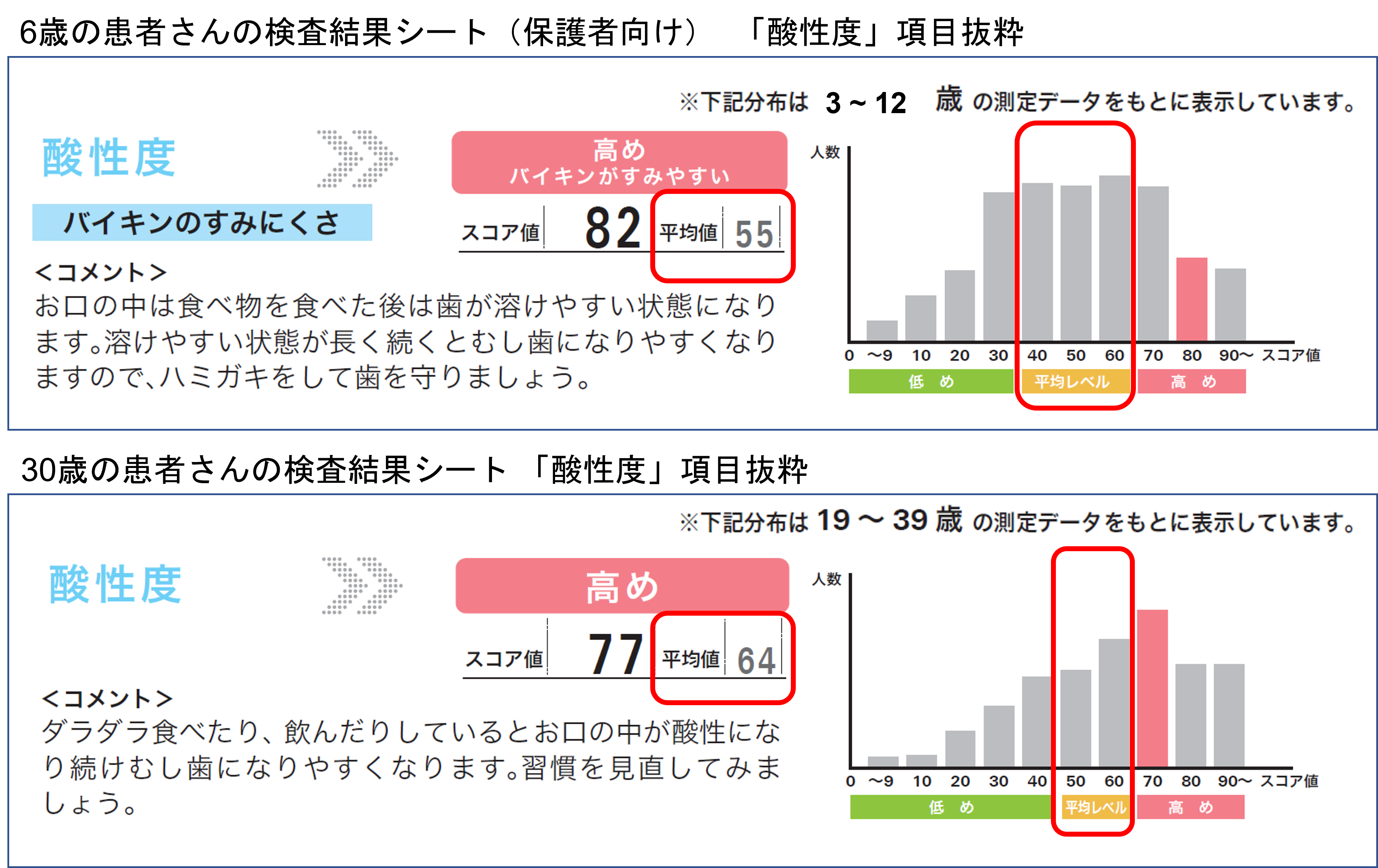 ヒストグラムからは同年代の患者さんの分布と、ご自身の位置を容易に比較することができ、よりご自身のお口への興味関心が高まります。