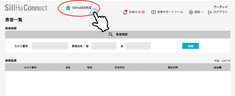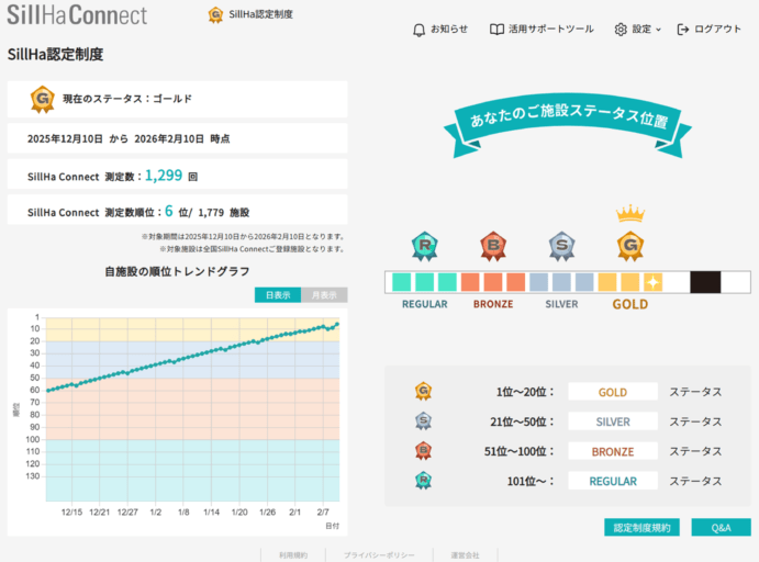 SillHa Connectブラウザページより、認定制度ページへアクセスいただく事でご施設の測定回数、順位、ステータスをご確認いただけます。